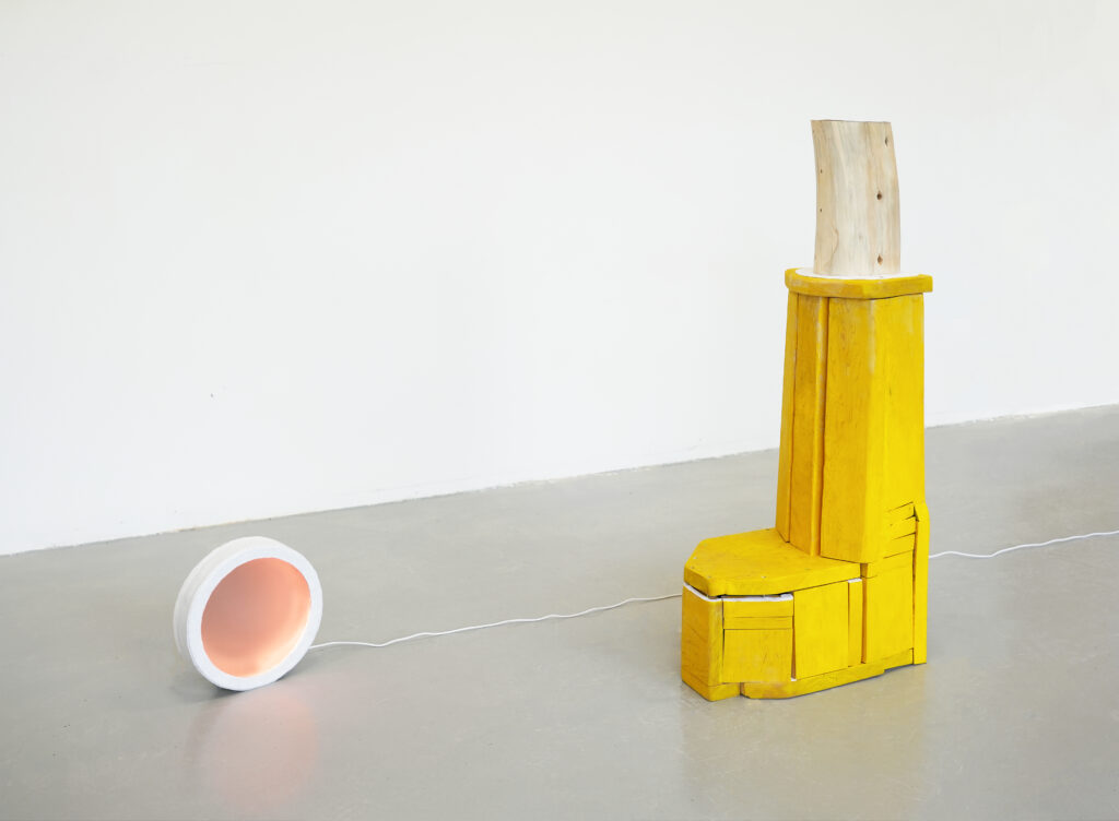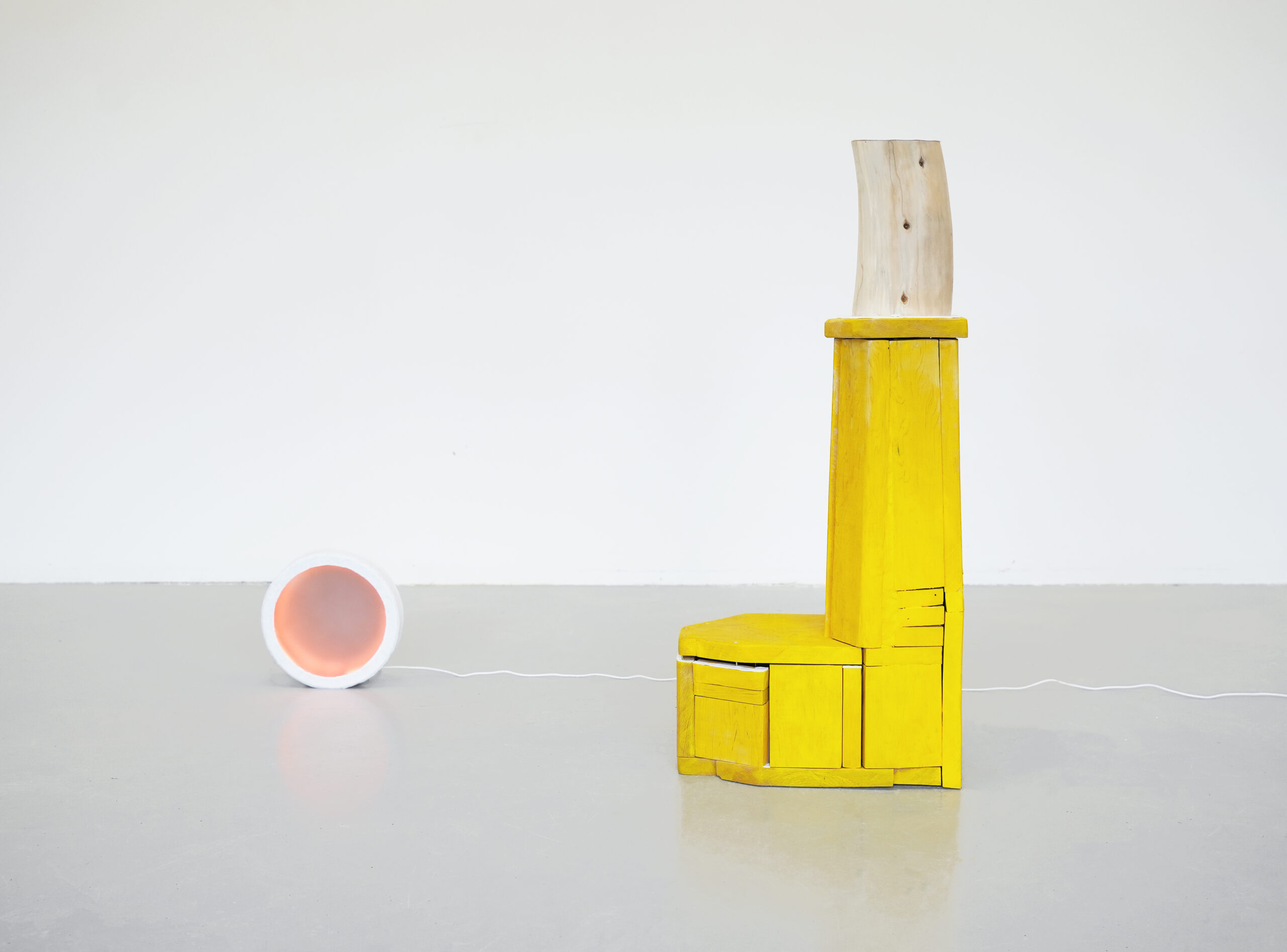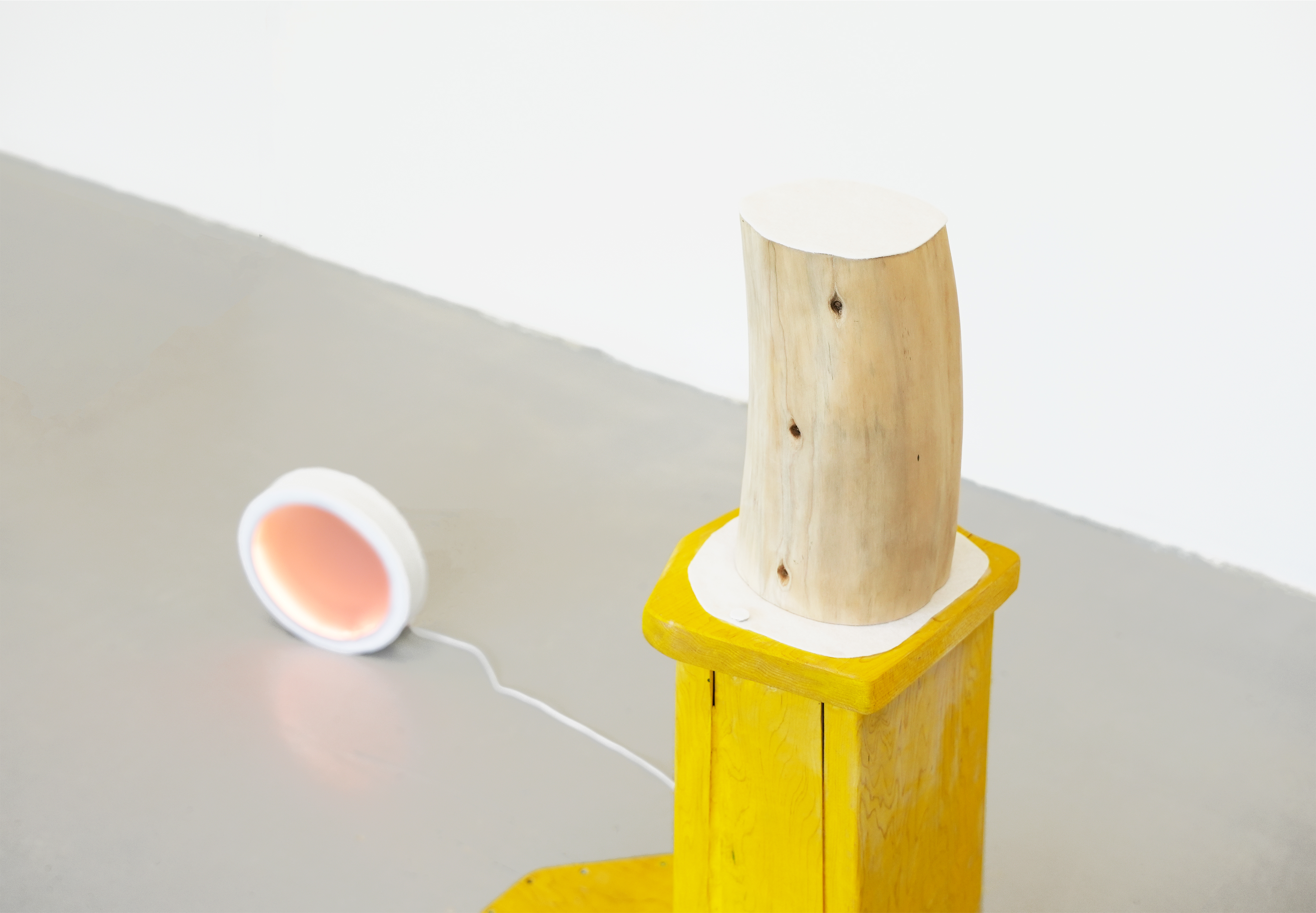 A Yellow Boot and a Winter Sun is a work made of hardwood and light. The main part in yellow made by maple wood resembles a boot, while the material’s heavy and bulky quality, and the way it is presented, gives it a sense of solidity. This work continues my experiment of white felt as a material, its light texture resembles the thin snow covering the ground in winter.